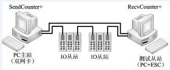 圖6為冗余系統(tǒng)的實驗驗證系統(tǒng) ,由1個主站 (PC)、2個EtherCAT2IO從站和1個測試從站(PC)組成.主站向從站發(fā)送周期讀寫數(shù)據(jù). 分別在 PC主站程序和測試從站程序的應(yīng)用層中設(shè)置發(fā)送計數(shù)器SendCounter和接收計數(shù)器Recv2 Counter,記錄發(fā)送和接收的周期幀數(shù)量. 在一段時間內(nèi),接收計數(shù)器和發(fā)送計數(shù)器的差值即為該時間段內(nèi)的總丟幀數(shù).