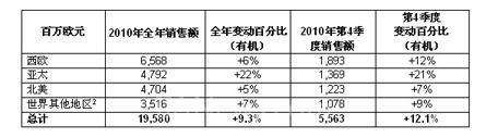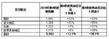 2010年第4季度銷售額達(dá)到55.63億歐元,按目前浮動結(jié)構(gòu)和匯率計算,增長36.1%。銷售額同比增長12.1%。