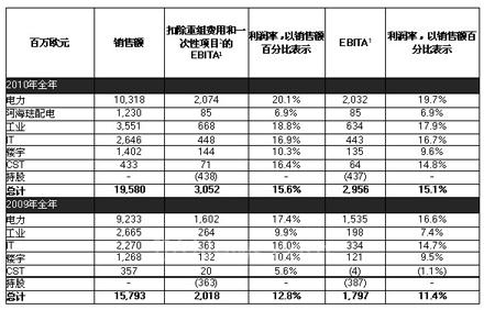 阿海琺配電在2010年下半年從6月到12月期間內(nèi)被合并。它產(chǎn)生的銷售額為12.30億歐元,EBITA為8500萬歐元,占銷售額的6.9%,超出了在其整合開始時設(shè)定的銷售額11億歐元和利潤率5%的目標(biāo)。此交易為2010年內(nèi)的EPS增加部分。