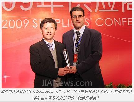 武漢博澤總經(jīng)理Marc Bourgeois先生(右)和華南銷售總監(jiān)(左)代表武漢博澤領(lǐng)取由東風(fēng)雪鐵龍授予的“特殊貢獻獎”