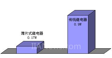 直流工作下薄片式繼電器與同等規(guī)格傳統(tǒng)繼電器平均能耗對(duì)比, 薄片式繼電器能耗僅為傳統(tǒng)繼電器的19%.