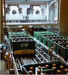 瓶身旋轉(zhuǎn)系統(tǒng)有二條平行的輸送帶,每個(gè)循環(huán)處理十箱啤酒。 輸送帶上方約 1.5 公尺處裝有兩個(gè)工業(yè)用像機(jī),每個(gè)像機(jī)監(jiān)控各自輸送帶上的五箱啤酒。