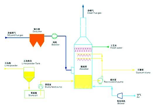 鍋爐煙氣經(jīng)電除塵器除塵后,通過增壓風機、進入吸收塔, 在吸收塔內煙氣向上流動且被向下流動的循環(huán)漿液以逆流方式洗滌。循環(huán)漿液則通過噴漿層內設置的噴嘴噴射到吸收塔中,以便脫除SO2、SO3,與此同時在“強制氧化工藝”的處理下反應的副產物被導入的空氣氧化為石膏,并消耗作為吸收劑的石灰石。循環(huán)漿液通過漿液循環(huán)泵向上輸送到噴淋層中,通過噴嘴進行霧化,可使氣體和液體得以充分接觸。每個泵通常與其各自的噴淋層相連接,在吸收塔中,石灰石與二氧化硫反應生成石膏,這部分石膏漿液通過石膏漿液泵排出,進入石膏脫水系統(tǒng)。經(jīng)過凈化處理的煙氣流經(jīng)兩級除霧器除霧,在此處將清潔煙氣中所攜帶的漿液霧滴去除。同時按特定程序不時地用工藝水對除霧器進行沖洗。在吸收塔出口,煙氣一般被冷卻到46~55℃左右,且為水蒸氣所飽和。通過加熱器將煙氣加熱到80℃以上,以提高煙氣的抬升高度和擴散能力。最后,潔凈的煙氣通過煙道進入煙囪排向大氣。