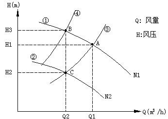 曲線①為風機按轉速N1工作時的特性曲線,曲線②為風機按轉速N2工作時的特性曲線,③④為風道阻力曲線。