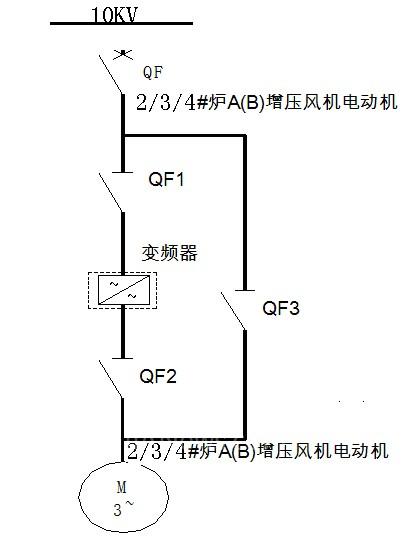 基本原理:它是由3組高壓開關柜QF1、QF2和QF3組成。要求開關柜QF2和QF3不能同時閉合。變頻運行時,開關柜QF1和QF2閉合,開關柜QF3斷開;工頻運行時,開關柜QF3閉合,開關柜QF1和QF2斷開。