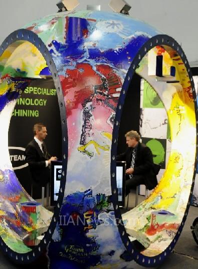 漢諾威,2011年4月4日 德國(guó)漢諾威工業(yè)博覽會(huì)向公眾開(kāi)放 4月4日,在德國(guó)北部城市漢諾威的漢諾威工業(yè)博覽會(huì)上,一臺(tái)涂上裝飾油彩的風(fēng)力發(fā)電機(jī)輪轂現(xiàn)身展臺(tái)。">