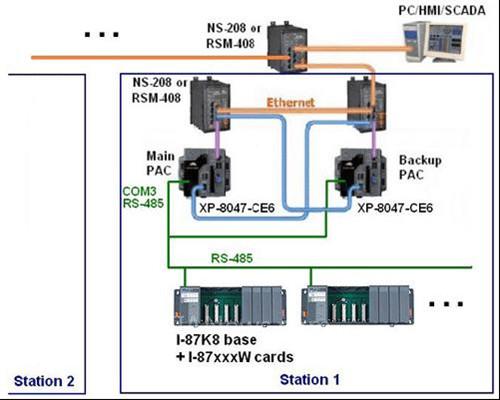 本應用使用 XP-8xx7-CE6 系列 PAC (可編程控制器) 來完成冗余設(shè)計,以兩臺 XP-8xx7-CE6 PAC 控制器搭配I-87K8 或 Modbus I/O 或 其它 I/O 來提供四種類型的冗余系統(tǒng)應用,客戶可配合不同的現(xiàn)場需求,選擇任何一種類型的冗余系統(tǒng)加以應用,一旦設(shè)備因傳輸發(fā)生不可抗拒的意外時,冗余系統(tǒng)可快速恢復系統(tǒng)運作,爭取設(shè)備的修復時間,減少因系統(tǒng)停頓而帶來的損失。