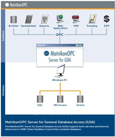 MatrikonOPC ODBC服務(wù)器支持對(duì)ODBC, MS SQL以及Oracle等數(shù)據(jù)庫(kù)的實(shí)時(shí)和歷史數(shù)據(jù)訪問。用戶可以通過(guò)ODBC數(shù)據(jù)源的表字段、自定義查詢或者存儲(chǔ)過(guò)程來(lái)映射OPC數(shù)據(jù)項(xiàng)的名字、值、質(zhì)量和時(shí)間戳。需要與數(shù)據(jù)庫(kù)相連的應(yīng)用程序可以使用MatrikonOPC服務(wù)器來(lái)訪問實(shí)時(shí)和歷史數(shù)據(jù)。