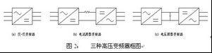 其中交—直—交變頻器又可根據(jù)直流環(huán)節(jié)采用大電感以平抑電流脈動(dòng)的變頻器稱為電流源型變頻器,直流環(huán)節(jié)采用大電容抑制電壓波動(dòng)的變頻器則稱為電壓源型變頻器。圖2所示為三種高壓變頻器框圖。