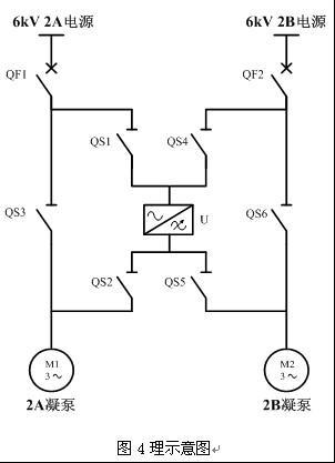 基本原理:它是由六個(gè)高壓隔離開關(guān)QS1~QS6組成(見圖4)。其中QS1和QS4,QS2和QS5有電氣互鎖;QS3和QS2,QS6和QS5安裝機(jī)械互鎖裝置。如果兩路電源同時(shí)供電,A凝泵工作在變頻狀態(tài),B凝泵工作在工頻狀態(tài)時(shí),QS3和QS4、QS5分閘,QS1、QS2和QS6處于合閘狀態(tài);B凝泵工作在變頻狀態(tài),A凝泵工作在工頻狀態(tài)時(shí),QS1和QS2、QS6分閘,QS3、QS4和QS5處于合閘狀態(tài);如果檢修變頻器,QS3和QS6可以處于合閘狀態(tài),其它隔離開關(guān)都分閘,兩臺(tái)負(fù)載可以同時(shí)工頻運(yùn)行;當(dāng)一路電源檢修時(shí),可以通過分合隔離開關(guān)使任一電機(jī)變頻運(yùn)行。