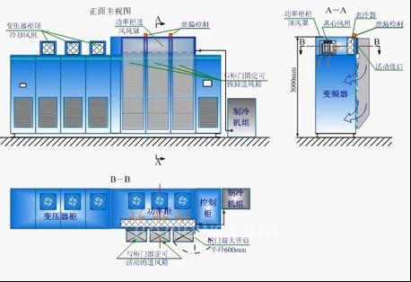 為保障變頻設(shè)備處于安全運(yùn)行,避免環(huán)境溫度和粉塵對(duì)設(shè)備的不利影響,在變頻器功率柜側(cè)獨(dú)立增加密閉式強(qiáng)制冷卻系統(tǒng)。該系統(tǒng)作為變頻功率柜外的附屬裝置,能夠保證變頻功率柜始終處于25~40℃運(yùn)行環(huán)境,大幅度延長(zhǎng)濾網(wǎng)更換周期,少現(xiàn)場(chǎng)維護(hù)量。不需要為變頻器再獨(dú)立建筑房屋,變壓器柜采用開放式冷卻。強(qiáng)制冷卻裝置與變頻器功率柜一體化設(shè)計(jì),附著于功率柜頂部。制冷壓縮機(jī)組安裝于變頻器柜附近。