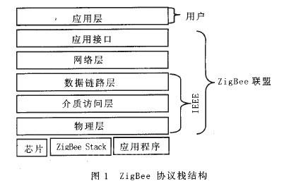 ZigBee技術(shù)作為一種新興的無線通信技術(shù),與藍牙和WIFI相比,具有距離短、復(fù)雜度低、功耗低、數(shù)據(jù)速率低、成本低和自組網(wǎng)等特點,適合于自動控制領(lǐng)域的傳感器和執(zhí)行機構(gòu)等設(shè)備的聯(lián)網(wǎng),ZigBee是 一組基于IEEE802.15 .4無線標(biāo)準(zhǔn)研制開發(fā)的有關(guān)組網(wǎng)、安全和應(yīng)用軟件方面的技術(shù)標(biāo)準(zhǔn)。協(xié)議?;陂_放互連標(biāo)準(zhǔn)OSI 7層模型,由應(yīng)用層、應(yīng)用接口、網(wǎng)絡(luò)層、數(shù)據(jù)鏈路層和物理層組成。網(wǎng)絡(luò)層以上的協(xié)議由ZigBee聯(lián)盟負責(zé)制定,IEEE制定物理層和鏈路層標(biāo)準(zhǔn),其結(jié)構(gòu)圖如圖1所示。