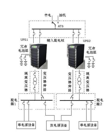 該方案采用一路市電,一路油機通過ATS轉(zhuǎn)換后給UPS供電。兩臺UPS的主輸入和旁路輸入都分別由輸入配電柜內(nèi)的不同開關(guān)引入。主機采用臺達(dá)C系列模塊化UPS,可根據(jù)負(fù)載需要陸續(xù)擴(kuò)容,始終保持各機單獨帶載時模塊還是N+1冗余的。每臺UPS至少配置兩組蓄電池,每組蓄電池都有自己的開關(guān)。UPS輸出側(cè)可根據(jù)零地電壓的高低決定是否增加隔離變壓器,如須增加隔離變壓器,則該變壓器采用H級絕緣等級的,并且配上旁路開關(guān)。兩臺UPS的輸出分別接到兩個配電箱內(nèi),雙電源設(shè)備直接從兩個配電箱內(nèi)取電;單電源設(shè)備分別從UPS1或者UPS2的輸出配電箱內(nèi)取電,實現(xiàn)正常情況下兩臺UPS的負(fù)載均分,單電源設(shè)備上游的配線和空開也采用冗余配置。