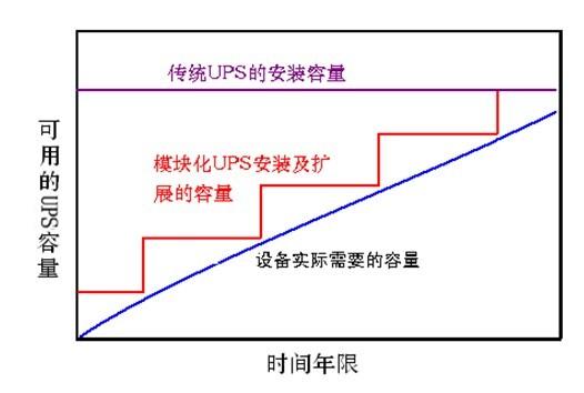 傳統(tǒng)的大型工頻UPS體積龐大,擴(kuò)容時相應(yīng)的空開﹑電纜﹑電池﹑空間等都要相匹配,很難實現(xiàn)在線擴(kuò)容。所以在開始設(shè)計和建造數(shù)據(jù)中心時,往往就對以后幾年的負(fù)載量進(jìn)行了預(yù)估,將UPS設(shè)備一步到位。這樣一開始就要投入一筆巨額資金,并且在數(shù)據(jù)中心運行初期,各UPS的負(fù)載量可能還不到其額定容量的10%,相應(yīng)的設(shè)備效率也不會超過50%,造成資源的極大浪費。