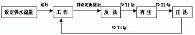 在軟水處理器運(yùn)行過程中,在發(fā)現(xiàn)出水水質(zhì)不合格而需要罐內(nèi)樹脂重新再生時(shí),可使用強(qiáng)制再生程序。在這種方式下,按下強(qiáng)制再生按扭后,系統(tǒng)將由工作自動(dòng)轉(zhuǎn)為反洗,經(jīng)過T1時(shí)間后轉(zhuǎn)入再生,再生T2時(shí)間后轉(zhuǎn)入正洗,正洗T3時(shí)間后回到工作位置,完成強(qiáng)制再生過程。