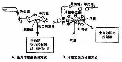 張力檢測裝置基本上有三種:一是用張力傳感器(即張力檢測器)對張力進(jìn)行檢測,通常兩個(gè)張力傳感器配對使用,將它們裝在檢測輥的兩端(如圖1A所示),料帶通過檢測輥施加負(fù)載,使張力傳感器敏感元件產(chǎn)生位移或變形,從而檢測出實(shí)際張力值,并將此實(shí)際張力信號送到全自動張力控制器,最終實(shí)現(xiàn)張力閉環(huán)控制。目前,張力傳感器有板簧式微位移張力檢測器(日本三菱LX-TD型),應(yīng)變電阻片張力檢測器(美國蒙特福T系列)和壓磁式張力檢測器(中國ABB枕式系列)等等。其優(yōu)點(diǎn)是檢測范圍寬,響應(yīng)速度快、線性好。