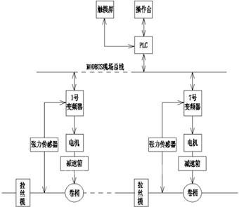 該系統(tǒng)用于4-9臺(tái)直進(jìn)式拉絲機(jī)的控制,控制方式為MODBUS(模擬量控制可選)。特點(diǎn)是所有參數(shù)開(kāi)放。