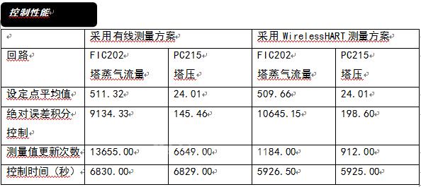 用WirelessHART無線變送器測量氣提流量和塔壓節(jié)省了布線成本。采用WirelessHART變送器和修正PID算法功能模塊進(jìn)行塔壓和加熱器蒸汽流量控制,實(shí)現(xiàn)的動(dòng)態(tài)響應(yīng)和性能與有線儀表加傳統(tǒng)PID運(yùn)算完全一樣。