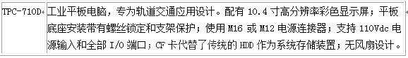 TPC-710D觸摸式平板電腦為軌道交通應(yīng)用系統(tǒng)定制產(chǎn)品,可為軌道交通系統(tǒng)操作員或管理員提供全面的控制數(shù)據(jù),如速度,溫度,門窗和其他監(jiān)控信息等。TPC-710D已經(jīng)應(yīng)用于中國多條軌道線路,事實證明,其可與系統(tǒng)充分兼容,性能卓越,性價比更高。