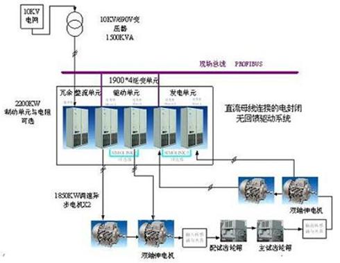 當(dāng)進(jìn)行大于1800KW 的齒輪箱或雙軸輸入齒輪箱測試時(shí),可將兩臺(tái)電機(jī)串聯(lián),并將一套變頻調(diào)速系統(tǒng)的控制權(quán)交給另一套系統(tǒng),通過兩套調(diào)速系統(tǒng)主從控制方式,使實(shí)驗(yàn)系統(tǒng)總拖動(dòng)功率達(dá)到3600KW。在齒輪箱的輸出側(cè),也可選擇使用兩臺(tái)發(fā)電機(jī)串聯(lián)運(yùn)行以實(shí)現(xiàn)大功率齒輪箱測試與能量反饋。當(dāng)進(jìn)行小于1800KW功率齒輪箱測試時(shí),該系統(tǒng)可以組成二套滿負(fù)荷功率為1800KW,能量反饋閉式控制的齒輪箱綜合測試控制系統(tǒng)。
