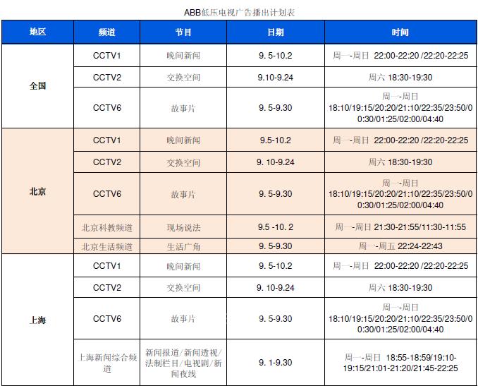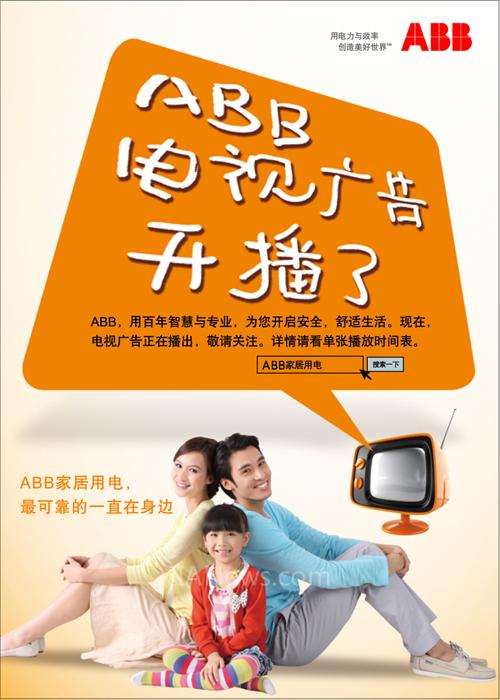 ABB低壓已于2011年8月29日開(kāi)始陸續(xù)在全國(guó)范圍內(nèi)推出面向大眾消費(fèi)市場(chǎng)的第一支電視廣告, 這也是ABB在中國(guó)推出的首支電視廣告。廣告首輪投放時(shí)間為8月29日至10月2日,將通過(guò)中央電視臺(tái)一套、二套、六套以及北京、上海、廣州和重慶的地方頻道播出。