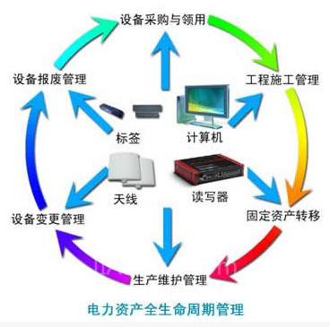 在電力系統(tǒng)中,設備繁雜,種類較多,這給資產的管理帶來困難。在資產管理中僅使用單純的紙面或傳統(tǒng)方法無法滿足資產管理可視化的需要,不利于企業(yè)了解各種設備當前的狀態(tài),而企業(yè)清查資產或進行設備巡檢并了解狀況,常常要消耗大量寶貴的時間和人力物力,同時也需要員工具有很高的責任心。這就要求我們尋找一種能快速、準確識讀批量設備的方式,這就是遠距離批量射頻識別技術。電力資產全生命周期管理如下所示: