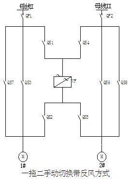 同時(shí)工頻運(yùn)行時(shí)1#電機(jī)通過QS7、QS3 ,2#電機(jī)通過QS8、QS6切換完成反風(fēng)功能,變頻運(yùn)行時(shí)通過變頻設(shè)備內(nèi)部設(shè)置即可完成電機(jī)轉(zhuǎn)向的正反方向的轉(zhuǎn)換完成反風(fēng)功能。