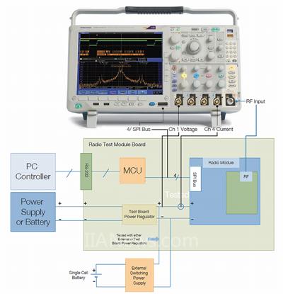 圖1.被測(cè)器件(Microchip Technologies MRF89XA 868 MHz無(wú)線電)與混合域示波器之間的測(cè)試連接