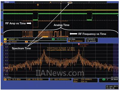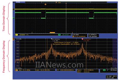 畫(huà)面的下半部分顯示了RF信號(hào)的頻域視圖,在本例中是無(wú)線電發(fā)射機(jī)輸出,畫(huà)面的上半部分是時(shí)域的傳統(tǒng)示波器視圖。頻域視圖中顯示的頻譜來(lái)自時(shí)域視圖中短橙色條指明的時(shí)間周期,稱為頻譜時(shí)間(Spectrum Time)。