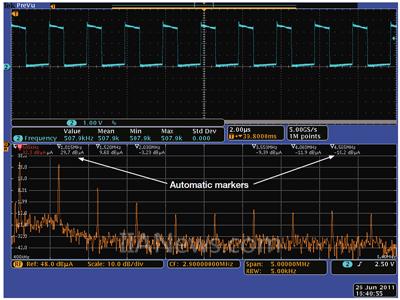 可以使用商用EMI電流探頭測(cè)量來(lái)自電源的噪聲,電流探頭用來(lái)觀察來(lái)自圖5中開(kāi)關(guān)裝置的噪聲。在本例中,開(kāi)關(guān)裝置由電阻器和小型電容器提供載荷。MDO中的自動(dòng)標(biāo)記功能用來(lái)顯示電源發(fā)出的最明顯的七個(gè)信號(hào)的頻率和幅度。MDO4000系列可以提供最多11個(gè)自動(dòng)標(biāo)記,用絕對(duì)值顯示結(jié)果,或作為相對(duì)值顯示參考最大信號(hào)的結(jié)果。最高值一直表示為紅色參考(Red Reference)標(biāo)記。注意基礎(chǔ)頻率和二階諧波的電平大體相同,約為30 dBuA。屏幕的上半部分顯示了MCP1640 IC開(kāi)關(guān)晶體管上的波形。我們使用測(cè)量功能顯示開(kāi)關(guān)頻率,確認(rèn)RF標(biāo)記測(cè)量。