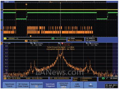 為簡(jiǎn)便地看到無(wú)線電中的數(shù)據(jù)包傳輸,我們?cè)跁r(shí)域視圖中增加了RF隨時(shí)間變化曲線。標(biāo)有“A”的橙色曲線顯示了瞬時(shí)RF幅離隨時(shí)間變化。標(biāo)有“f ”的橙色曲線顯示了相對(duì)于畫(huà)面中心頻率的瞬時(shí)RF頻率隨時(shí)間變化。綠色曲線(通道4)顯示了到模塊的電流??梢钥吹剑娏鲝臄?shù)據(jù)包之間接近0上升到傳輸期間大約40 mA。黃色曲線(通道1)顯示了模塊電源電壓上的AC紋波。注意在傳輸期間只有很小的電壓暫降。