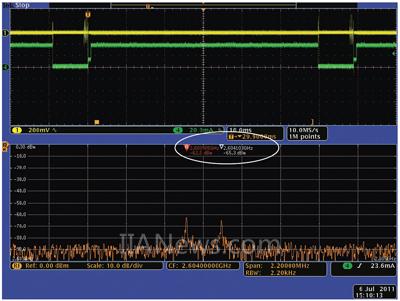 在電源驅(qū)動(dòng)RF電路板時(shí),噪聲功率的時(shí)域畫(huà)面和頻域畫(huà)面變化。圖6顯示了相同的電源噪聲及額外的信號(hào)。注意二階諧波下降,但有許多其它低電平噪聲。部分噪聲可能會(huì)給無(wú)線電接收機(jī)的運(yùn)行帶來(lái)很大干擾,需要認(rèn)真評(píng)估。