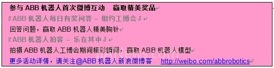 來ABB展臺,與我們一起樂活2011工博會,了解您每天精彩生活更多的背后故事,參與機(jī)器人互動小游戲,領(lǐng)略ABB機(jī)器人的新產(chǎn)品、新技術(shù),一定讓您樂在其中!
