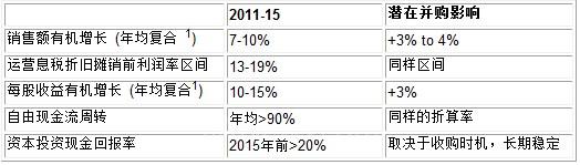 ABB預(yù)計2011-2015年期間,集團(tuán)銷售額年均復(fù)合有機(jī)增長率達(dá)到7-10%,同期全球GDP預(yù)期增長率為3-4%,市場總體預(yù)期增長率為5-6%。2011-2015年期間,該階段的并購——規(guī)模和時機(jī)取決于市場情況——將使ABB在有機(jī)增長的基礎(chǔ)上再增加3-4個百分點(diǎn)。