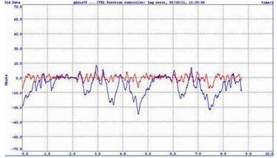 下圖是實際通過B&R Automation Studio的軸監(jiān)測的示波器功能對整個輸出進行采樣得到的扭矩控制過程變化曲線,其中藍色曲線為關(guān)閉前饋控制的情況,可以看到,其扭矩變化的波動較大;而紅色曲線則表明了采用了前饋控制后的效果,明顯地提高了力矩輸出的穩(wěn)定性。