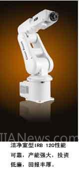 ABB小型機器人產(chǎn)品經(jīng)理Nicolas De Keijser就新款潔凈室機型評論道:“在開發(fā)第四代多用途機器人的過程中,我們發(fā)現(xiàn)電子、太陽能、醫(yī)療這類要求具備嚴(yán)格潔凈室環(huán)境的行業(yè),迫切需要一款快速、緊湊的機器人產(chǎn)品?!睗崈羰倚虸RB 120經(jīng)獨立機構(gòu)Fraunhofer IPA(弗勞恩霍夫制造技術(shù)與自動化研究所)測試,已獲得“ISO 5級潔凈室”(100級)達標(biāo)認證。