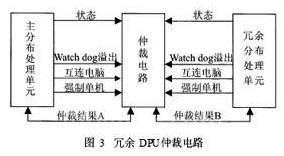 從圖3中可看出雙分布處理單元仲裁電路工作原理為將分布處理單元各自自身之診斷結(jié)果加到仲裁電路上,并讀取相應(yīng)的仲裁結(jié)果,以確定自身之主輔狀態(tài)。通過(guò)編程,確定各狀態(tài)的優(yōu)先級(jí),由于雙分布處理單元均根據(jù)仲裁之結(jié)果確定各自之主輔狀態(tài),故只要仲裁結(jié)果變化了,雙分布處理單元?jiǎng)t自動(dòng)進(jìn)行切換。