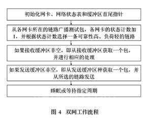 對(duì)于測(cè)試包的廣播,只要本節(jié)點(diǎn)上的網(wǎng)卡在線(xiàn)運(yùn)行,即從相應(yīng)的鏈路發(fā)送,測(cè)試包發(fā)送完畢之后,根據(jù)網(wǎng)絡(luò)狀態(tài)表,可以選擇一條正常運(yùn)行的節(jié)點(diǎn)數(shù)較少的,負(fù)荷較輕的鏈路,用于數(shù)據(jù)包發(fā)送。雙網(wǎng)的工作流程見(jiàn)圖4。