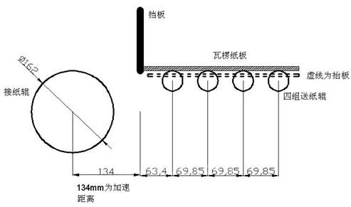 在接紙輥編碼器旋轉(zhuǎn)到設(shè)定相位時,抬板放下,使瓦楞紙與送紙輥充分接觸;然后啟動送紙輥電機,在如上圖所示的134mm的距離內(nèi)加速到接紙輥的線速度,進入同步傳送;當(dāng)接紙輥編碼器轉(zhuǎn)到相應(yīng)相位時,抬板抬起,等到瓦楞紙與送紙輥充分脫離后,觸發(fā)送紙軸減速(在規(guī)定相位里減至0速),然后等待下一次送紙時機。