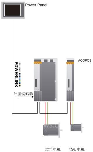 該系統(tǒng)配置如下,B&R的Power Panel由于其設(shè)計為控制、顯示與操作于一體,系統(tǒng)結(jié)構(gòu)簡單,通過在Power Panel后的通信卡連接驅(qū)動器,而且外接的編碼器可以直接插入到ACOPOS伺服驅(qū)動器。
