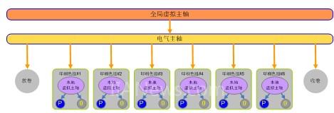對于印刷而言,為了確保高精度的印刷色組之間的電子齒輪同步,采用了虛擬主軸進行系統(tǒng)運動關(guān)系建模,所有實際的伺服軸均以此虛擬為軸為跟隨對象-由于采用虛擬是一個不存在的軸,因此,相對于傳統(tǒng)的機械軸而言,它可以是一個理想的模型,即,完全沒有機械誤差或累積誤差,其它的伺服軸通過不斷的獲得來自虛擬主軸的信號,并根據(jù)此來調(diào)節(jié)自身的位置環(huán),這樣通過POWERLINK 400uS的循環(huán)周期即可實現(xiàn)所有軸之間的同步關(guān)系。