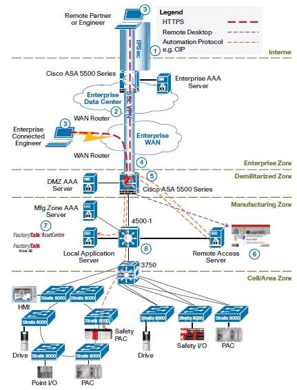一旦建立了訪問企業(yè)的網(wǎng)絡(luò),遠(yuǎn)程伙伴對公司資源的訪問具有明確限制。遠(yuǎn)程員工/工程師訪問的內(nèi)容由他們公司的帳號來決定。對遠(yuǎn)程伙伴訪問資源和應(yīng)用具有限制,要建立嚴(yán)格的訪問控制列表(ACL),通過限制IP地址和傳輸層端口號來執(zhí)行。在這種情況下,到工廠DMZ防火墻的訪問和使用HTTPS協(xié)議(端口號433)會受到限制。遠(yuǎn)程伙伴不能訪問所有其他無關(guān)IP地址和端口號,以維持公司的安保環(huán)境。