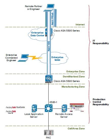 圖3概述了如何對遠(yuǎn)程訪問架構(gòu)進(jìn)行責(zé)任劃分。注意,這個(gè)圖對實(shí)際的現(xiàn)場網(wǎng)絡(luò)架構(gòu)進(jìn)行了簡化,針對需要遠(yuǎn)程訪問的關(guān)鍵部分進(jìn)行了描述。