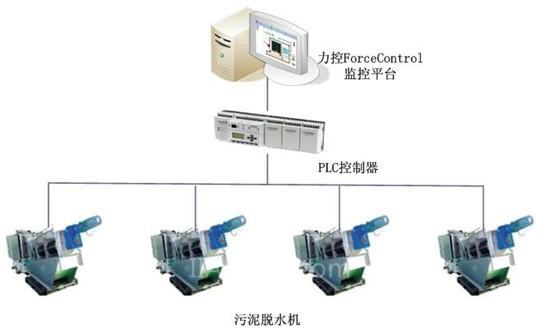 污泥脫水系統(tǒng)控制部分由力控ForceControl監(jiān)控組態(tài)軟件、PLC可編程控制器和外圍電氣元件、傳感器、脫水機等執(zhí)行機構(gòu)組成。上位軟件裝在控制室工控機中,工程師在軟件界面上的操作,實現(xiàn)對PLC及各個儀表模塊的控制。同時力控ForceControl監(jiān)控組態(tài)軟件,可實時顯示過程數(shù)據(jù),設(shè)備運行狀態(tài),系統(tǒng)報警的信息,確?,F(xiàn)場設(shè)備運行安全可靠。下圖所示為系統(tǒng)架構(gòu)示意圖。