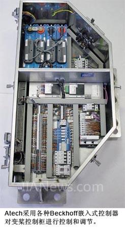 多款 Bechhoff 嵌入式控制器被廣泛用于實(shí)現(xiàn)葉片變槳距的控制和調(diào)節(jié)。它們的共同點(diǎn)是,都使用PROFIBUS從站接口與主控制器相連接,PROFIBUS電纜通過滑環(huán)連接到機(jī)艙上。采用全新設(shè)計(jì)的變槳控制系統(tǒng)的主要特點(diǎn)是:所用的動(dòng)力部件和電池充電器之間通過 CANopen通訊,且整個(gè)系統(tǒng)結(jié)構(gòu)更加緊湊。Beckhoff的CX9000嵌入式控制器的網(wǎng)絡(luò)接口操作特別簡單,使得調(diào)試工作也更加容易。