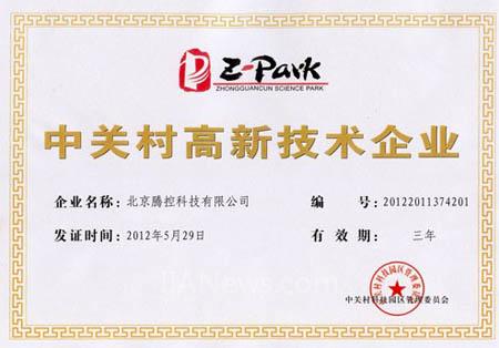 北京騰控科技有限公司憑借自主創(chuàng)新技術(shù),于2012年5月29日獲得中關(guān)村科技園區(qū)管理委員會認(rèn)可,授予“中關(guān)村高新技術(shù)企業(yè)”稱號,并頒發(fā)證書。