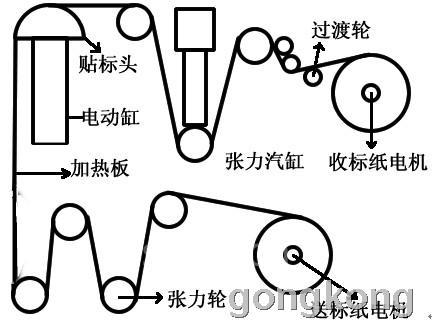 要求在一個塑料桶的雙面上貼上廠家的標簽和里面所裝的物品的參數(shù)。首先人工把一個生產(chǎn)好的塑料桶放到傳送帶上,傳送帶是由一個普通的電機驅(qū)動,傳送帶上有一個兩側(cè)可以調(diào)整的導軌槽,塑料桶就放在導軌槽上運行。在傳送帶的兩側(cè)各有一個靠液化氣進行加熱的裝置,在塑料桶過來以后對其A、B兩側(cè)進行加熱,傳送帶把桶往前運送,當一個光電傳感器檢測上以后,傳送給控制器,由控制器發(fā)送一個命令給傳送帶上部的扶穩(wěn)沖氣裝置,這個裝置帶著一個氣管落到塑料桶的桶口上,并且往桶里面沖氣,使桶形成一個外凸的圓弧形狀。在這個過程中,傳送帶一直運行,上面的扶穩(wěn)沖氣裝置通過一個同步帶由一個電機驅(qū)動,這個電機的運動由控制器控制,這里要求這個電機從加速度到恒速到減速度停止時,這個時候的的運行速度必須和傳送帶的運行速度嚴格要求一致,否則這個桶就會偏到或者在機械裝置上刮蹭了。在這個動作的同時,需要開始貼標,這是有三個電機和機械裝置一起組合完成,其中的一個電機負責送標,另外一個電機否則收標,還有一個電機驅(qū)動貼標頭負責把標貼到塑料桶上,標在貼之前,必須進行加熱才能往塑料桶上貼住,這個貼標的速度也必須嚴格要求和傳送帶的速度一致,否則會造成貼的標變形。
