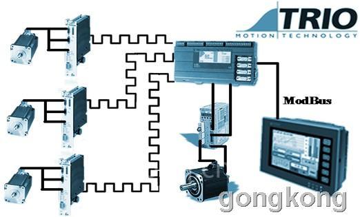 需要采用一個八軸半或者是兩個四軸半的數(shù)字運動控制器,所謂半個軸就是一個編碼器的輸入通道,四個軸分別控制四個電機,做扶穩(wěn)沖氣裝置、貼標裝置的三個的運動控制,兩側(cè)就需要八個軸,可以把兩側(cè)分開處理,所以也可以采用兩個四軸半的數(shù)字運動控制器。同時總共還需要有16個輸入點和3~6個輸出點,最后從各個方面考慮,選用兩個英國TRIO的數(shù)字運動控制器MC206來分別控制兩側(cè)的貼標;該控制器的通訊口具有ModBus協(xié)議,可以直接接觸摸屏。另外,該控制器既可以控制步進電機,也可以控制伺服電機,或者是兩者的任意結(jié)合。而且,該控制器除了控制軸所用的編碼器接收通道以外還專門帶一個編碼器的輸入口。