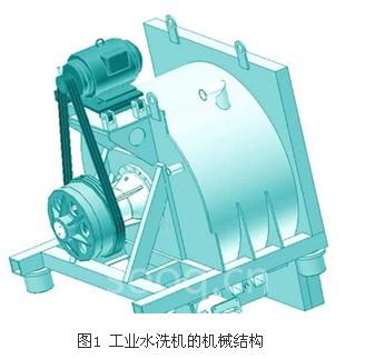 最初的工業(yè)水洗機(jī)都是采用雙速電機(jī)、三速電機(jī)乃至兩個(gè)雙速電機(jī)作為驅(qū)動(dòng)力,通過皮帶將動(dòng)能傳遞給滾筒,滾筒在轉(zhuǎn)動(dòng)過程中,帶動(dòng)并攪拌布草(被洗滌織物的總稱,下文均同)與洗滌溶液,達(dá)到洗凈布草的目的。不同洗滌能力的工業(yè)水洗機(jī),采用不同直徑的電機(jī)帶輪和滾筒帶輪以產(chǎn)生近似的轉(zhuǎn)速比,使?jié)L筒獲得較低的洗滌速度和較大的力矩。其機(jī)械結(jié)構(gòu)如圖1所示。