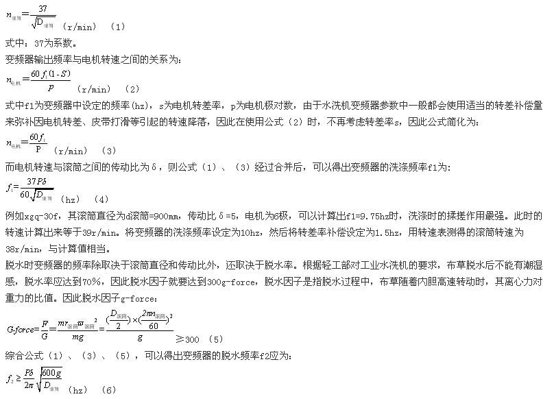 洗滌時(shí)變頻器的頻率決定于滾筒直徑和傳送比。要獲得最大揉搓作用,就要用適當(dāng)?shù)霓D(zhuǎn)速將布草帶到最高處然后落下,如果速度太慢,布草可能在較低的位置就已經(jīng)落下,揉搓作用較小;如果轉(zhuǎn)速太快,則由于離心力大于布草重力,布草無法落下,起不到揉搓作用。滾筒轉(zhuǎn)速與直徑的關(guān)系已知為: